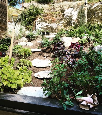 På baksidan en brygga från bakdörren över ängsblommor och förbi bärbuskar bort till trappan upp till bergsterrassen.